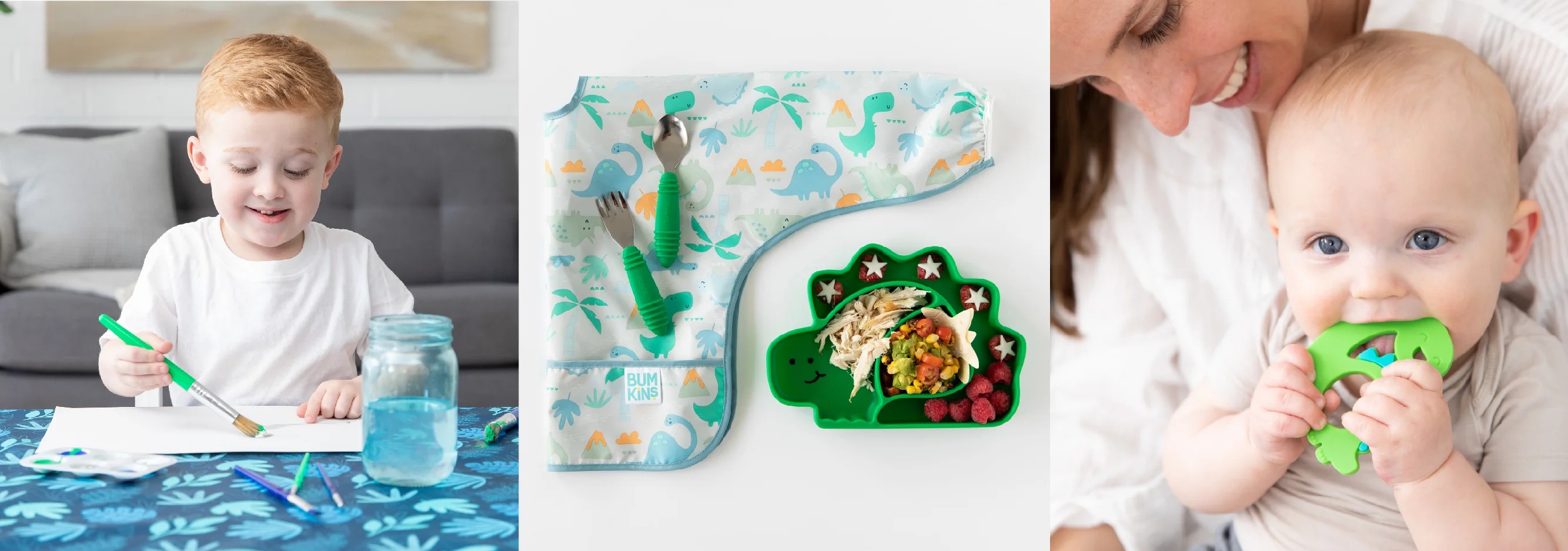 The Dinosaurs + Blue Tropic Collection combines playful prehistoric vibes with bold tropical patterns for a look that feels adventurous! From waterproof bags to silicone feeding gear, these essentials are built to keep mealtime (mostly) mess-free while adding a fun twist kids love. Durable, wipeable, and ready to handle all of life’s big messes and little adventures!